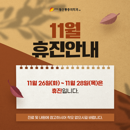 11월 26일 화요일부터 11월 28일 목요일까지 휴진입니다.