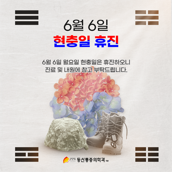 6월 6일 월요일 현충일은 휴진하오니 진료 및 내원에 참고부탁드립니다.