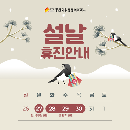 1월 28일(화) ~ 1월 30일(목)은 설 연휴 휴진입니다.