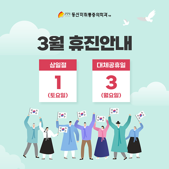 3월 1일(토) 삼일절 및 3월 3일(월) 대체공휴일은 휴진입니다.