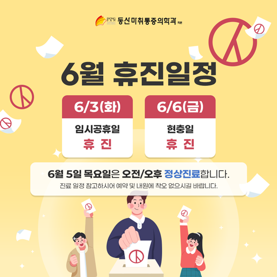 6월 3일(화) 임시공휴일 및 6월 6일(금) 현충일은 휴진입니다.