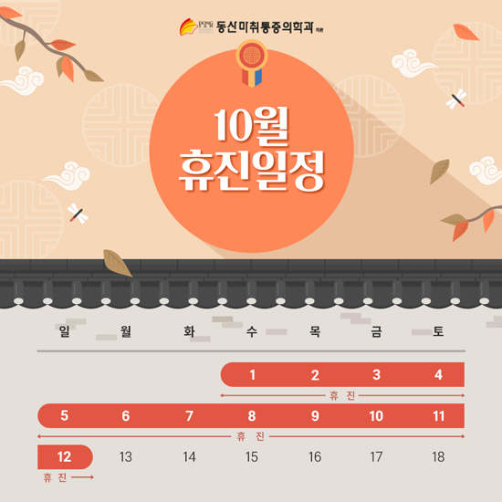 10월 1일(수) ~ 10월 12일(일)은 휴진입니다.