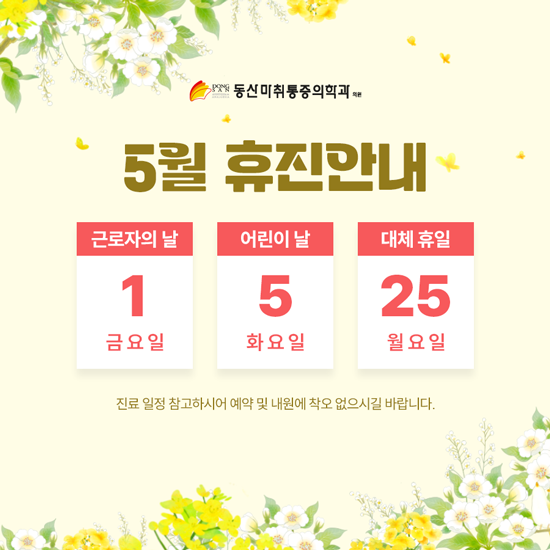 5월 1일(금) 근로자의 날, 5월 5일(화) 어린이 날, 5월 25일(월) 대체 휴일은 휴진입니다.