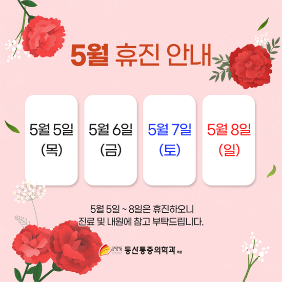 5월5일 ~ 8일은 휴진합니다. 진료 및 내원에 참고부탁드립니다.